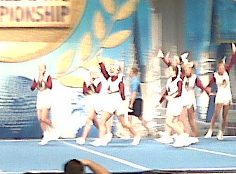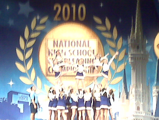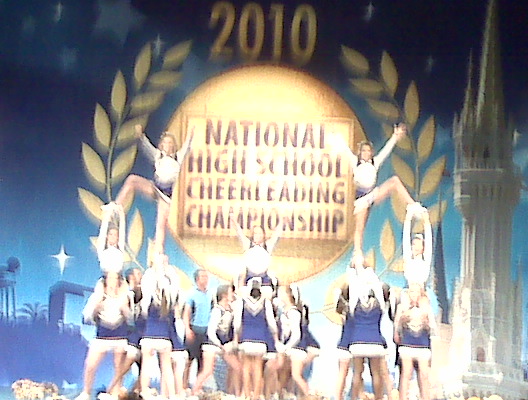 Pictured above: The EWMS cheerleaders took third best in the nation in their division in Orlando this afternoon. Pictured inset: The NHS Competition Cheerleaders take the stage in Orlando this afternoon. Pictured below: The NHS cheerleaders place eighth in their division. Pictured bottom: The EWMS cheerleaders perform their routine. Submitted cell phone photos by Wayne Holland for NorthEscambia.com, click to enlarge.