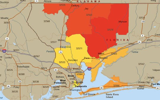 An environmental health study shows that residing in the Century, Jay or Cantonment zip codes may be unhealthy, while the McDavid/Walnut Hill and Molino zip codes are among the healthiest places to live in a two county area.