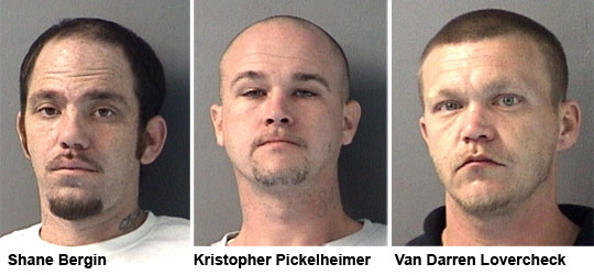 Kristopher Body Pickelheimer, 27, of Highway 95A Cantonment; Van Darren Lovercheck, 31, of Milton; and Shane Michael Bergin of Pensacola, were each charged with criminal mischief property damage, possession of burglary tools and burglary. All three were released from the Escambia County Jail on $5,500 bond each.