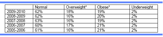 Let’s look at the last three year trend when current ninth graders were sixth graders. In ‘06/07, 25.6% were classified as obese and in ‘09/10, this group is classified at 21.0%. That’s a 4.6% decrease for these students. And now for over weight for the group, the numbers decrease from 18.3% to 18.2% – not a significant change, but when compared to the decrease of obese group, it would be logical to assume that many of obese kids would now fall into the overweight category.