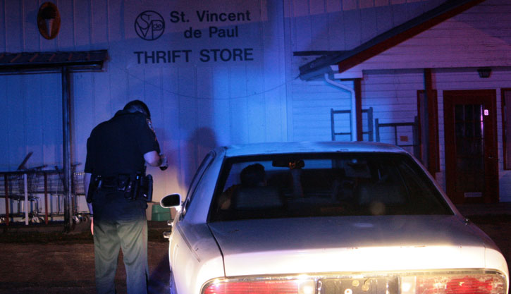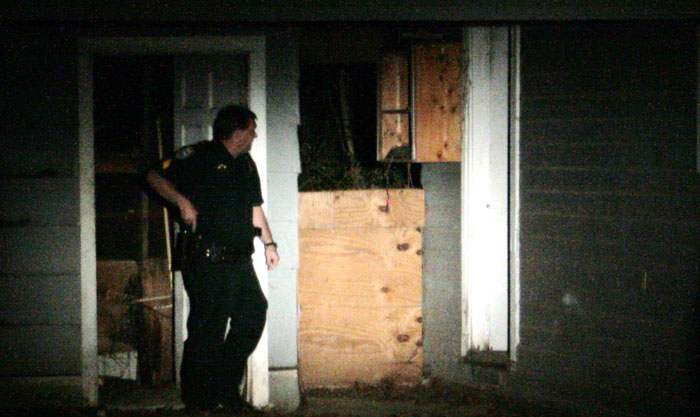 “We are going to clear this house,” Day said as we stopped in front of a run-down house. Day and Sgt. Mike Workman were going to check the abandoned house where tipsters said Simmons would sleep some nights. “If you see him run out, yell at us,” Day said as he trained the spotlight from his vehicle on the house.