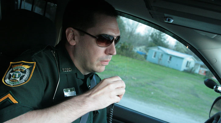 During our five hour ride along with Deputy Tod Day, Simmons was target number one. As we drove the streets of Century, Day pointed out the places that Simmons was known to frequent in Century. (Pictured: Deputy Tod Day radios an Escambia County Sheriff’s Office dispatcher.)