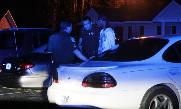 Things did not turn out as well for the driver on our next traffic stop — he was off to jail. We found him on Freedom Road near Camellia Gardens Apartments. He had just a paper dealer tag on his new used car. Day followed him into the parking lot of the apartment complex before turning on the blue lights.