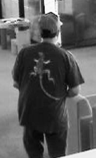 Pictured top: A bank robbery suspect receives an undetermined amount of cash during a Wednesday robbery of the Bank of America on East Nine Mile Road. Pictured inset: The man was wearing a shirt with a lizard design on the back. Pictured below: The man waits for the teller to read a note. Screen shots from surveillance video provided by the Escambia County County Sheriff’s Office for NorthEscambia.com, click to enlarge.