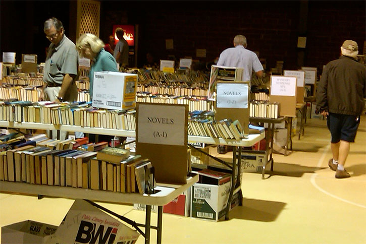 Pictured: Shoppers look for bargains Friday night at the Friends of the Pensacola Public Library Spring Book Sale in downtown Pensacola. Submitted photo for NorthEscambia.com, click to enlarge.
