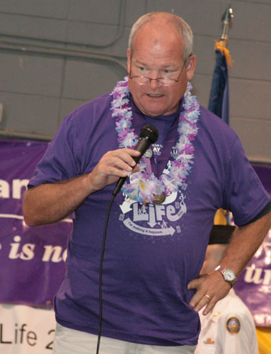 During Saturday’s opening ceremony, Tri-City Ledger Publisher Joe Thomas (pictured) spoke about his battle with prostate cancer during the past year — and his victory over the disease due to early intervention and technology made possible in part by the American Cancer Society.