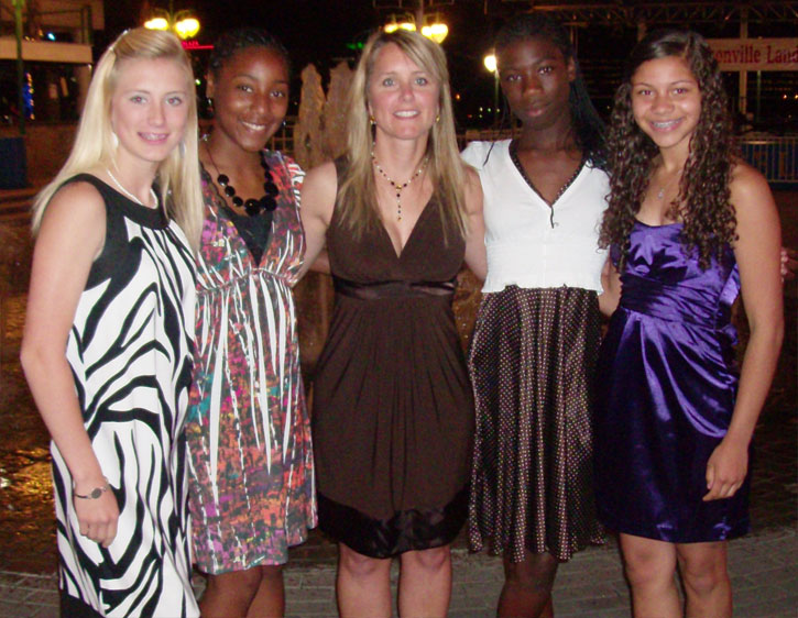 Pictured above: Northview’s 4×100 relay team Ariel Holland, Angel Mitchell, Laneicia Gomez and Tierra Floyd in Jacksonville Friday afternoon. Pictured below: The girls pose with Coach Natalie Nall (center) after dinner Thursday night at Jacksonville Landing. Submitted photos by Christal Bell for NorthEscambia.com, click to enlarge.