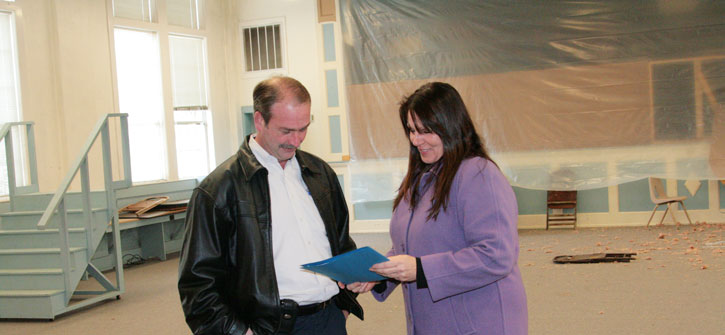 Pictured top: District 5 Escambia County Commissioner Kevin White and Escambia County Tax Collector Janet Holley discuss potential plans for the old Molino School in the auditorium of the facility back in February. Pictured bottom inset: This end of the old school will be converted into a library. NorthEscambia.com file photos, click to enlarge.