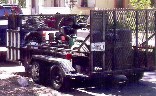 The 1990 six-foot trailer made of solid steel was painted solid black and had Florida tag number A802TY. The left side of the trailer had pipe for tool holders, and in two of the pipes there were pieces of broken wooden handles.