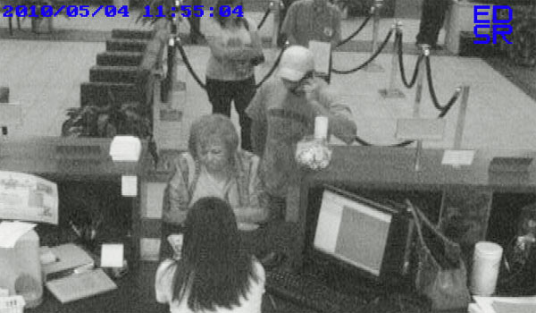 Pictured: This survelliance video from Pen Air Credit Union shows a daytime robbery suspect wearing a ball cap and talking on cell phone while forcing a woman to cash a check. Submitted photo for NorthEscambia.com, click to enlarge.