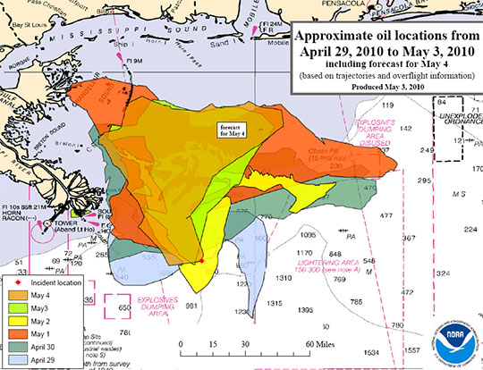 - On May 2, NOAA restricted fishing for a minimum of ten days in federal waters most affected by the BP oil spill, largely between Louisiana state waters at the mouth of the Mississippi River to waters off Florida’s Pensacola Bay. Effective immediately. Details: http://sero.nmfs.noaa.gov.