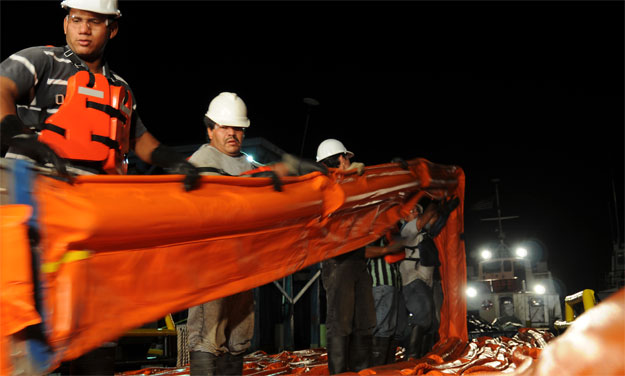 Pictured above: U.S. Environmental Services’ workers move oil containment boom onto a supply boat in the Gulf of Mexico. Staging areas have been set up along the Gulf Coast, including Pensacola Naval Air Station, to actively identify, target and protect environmentally and economically sensitive areas. U.S. Coast Guard photo for NorthEscambia.com, click to enlarge.