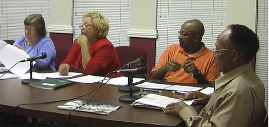 Pictured top: Century Town Council President Ann Brooks (left) reads the resume of new Town Clerk Darlene Peters Monday night as (L-R) Sharon Scott, Henry Hawkins and Gary Riley listen. NorthEscambia.com photo, click to enlarge.