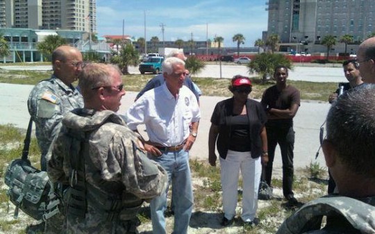 Florida Gov. Charlie Crist was on Pensacola Beach Saturday and Sunday, accessing the threat from the season’s first tropical storm and looking at the possibility that Alex could push more tar and oil into the Panhandle.