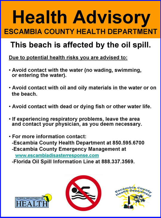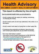 Effective immediately, in response to a report by the Escambia County Emergency Operations Center of numerous tar balls and matted mousse-like substance, the Escambia County (FL) Health Department is issuing a health advisory for the following beach waters in Escambia County, Florida, that have been affected by the Deepwater Horizon oil spill: