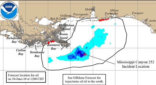 - A light to moderate easterly flow of five to 15 knots this morning shifts to the south-southeast this afternoon and will slightly lessen. This wind flow pattern will persist through the end of the week and currents will become more westward for the next few days. These two factors will combine to inhibit further eastward movement of the oil plume along the Florida Panhandle. Weather will be favorable for recovery operations this week as shower chances remain below 10 percent and seas remain calm at one to three feet.
