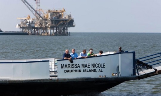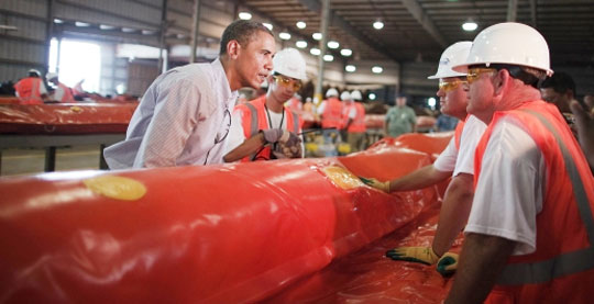 Pictured top: President Barack Obama talks with workers at an oil containment boom repair facility as he tours the Theodore Staging Facility in Theodore, Ala. on Monday. Pictured inset: President Barack Obama, third from left, rides a ferry from Dauphin Island, Ala., to Fort Morgan, Ala., past a natural gas rig, as he visits the Gulf Coast region affected by the BP Deepwater Horizon oil spill on Monday. From left, National Incident Commander Adm. Thad Allen, Mayor of Dauphin Island, Al., Jeff Collier; President Obama, Mayor of Gulf Shores, Al., Robert Craft, Alabama Gov. Bob Riley; and Senior Adviser Valerie Jarrett. White House photos by Chuck Kennedy for NorthEscambia.com, click to enlarge.