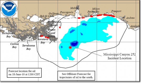 - Relatively weak winds (up to 10 knots), low seas (below two feet) and low rain chances are expected to continue through the next three days, which will be favorable for surface oil recovery operations. Winds are light and variable but are expected to turn west-southwesterly in the afternoons. A tropical wave in the central Atlantic has a 10% chance of becoming a tropical cyclone in the next 48 hours.