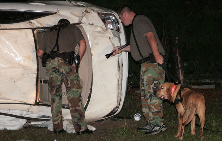 Officers on the scene believed that evidence indicated who was the driver. Acting on the information that the vehicle had been stolen, deputies called for a K-9 unit from the Century Correctional Institution. After searching the area for nearly an hour, K-9 officers were unable to locate the driver. Authorities on scene believed a passing vehicle may have picked him up shortly after the wreck. The search was called off about 2:50 a.m.