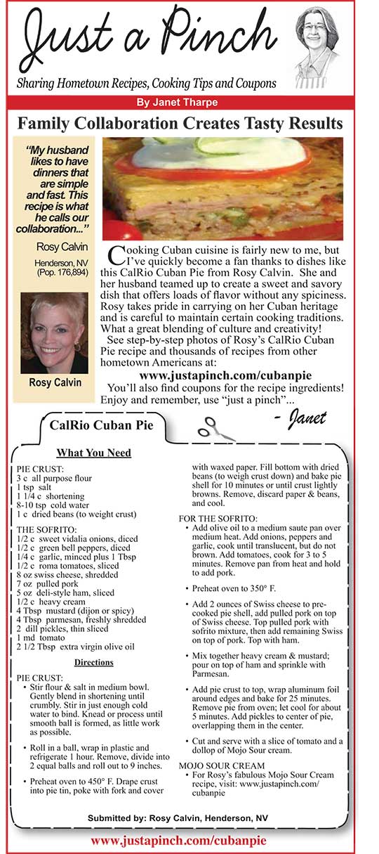 This weekend’s featured recipe from Janet Tharpe is a CalRio Cuban Pie. Pulled pork, deli ham, Roma tomatoes, Swiss cheese are more combine to create this flavorful ethnic dish.