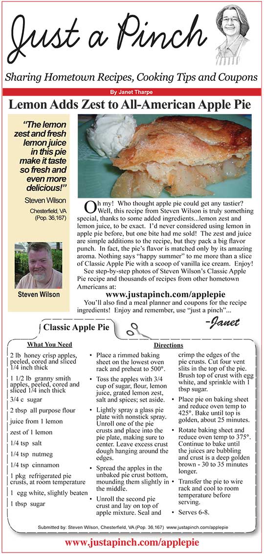 Today, we have the “Just a Pinch” column from Janet Tharpe. Janet features the best in hometown recipes from across the country. Today, its an All-American Apple Pie with Lemon Zest. You can click the image below to load a printable pdf with a recipe card.