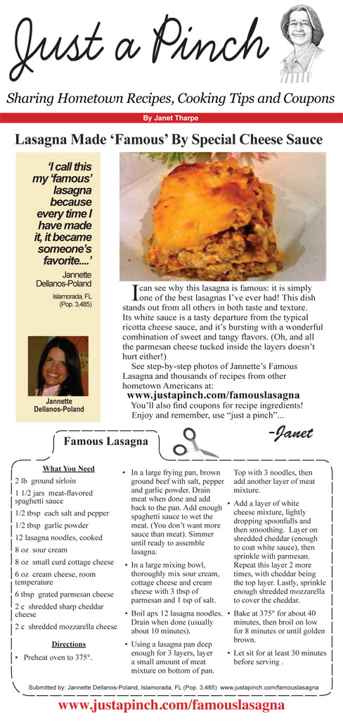 This weekend’s featured recipe from Janet Tharpe is a Lasagna Made “Famous” By Special Cheese Sauce. It’s bursting with a wonder combination of sweet and tangy flavors instead of the normal ricotta cheese filling.
