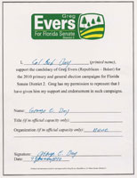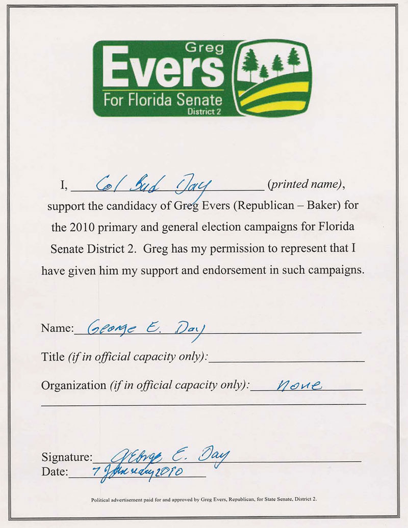 Evers’ campaign spokesperson, Sarah Bascom provided the media with a copy of Day’s signed endorsement dated January 9, 2010, and said “Greg Evers respects Colonel Day and his decision to change his support, but maintains and submits the attached as proof, that he did indeed receive this endorsement and would never mislead this community. A statement, Mr. Hill certainly cannot make as his negative, false and nasty campaign for Senate District 2 spirals out of control and continues to hinge on name calling and undignified behavior.”