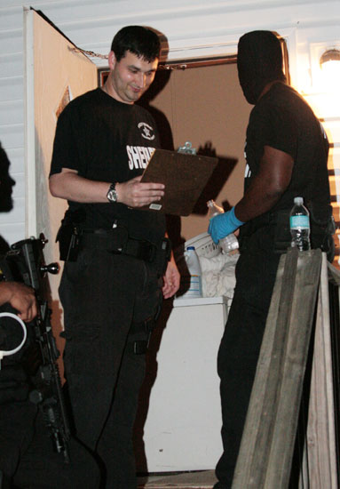 Pictured inset: Investigator Heath Jackson and other undercover Escambia County Sheriff’s Office Narcotics Unit agents at Karen Louise Quimby’s home on West Highway 4 as they execute a search warrant on June 9 . NorthEscambia.com exclusive file photo, click to enlarge.