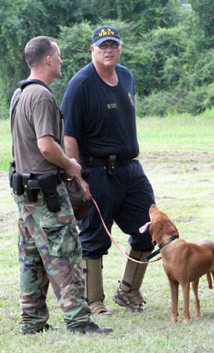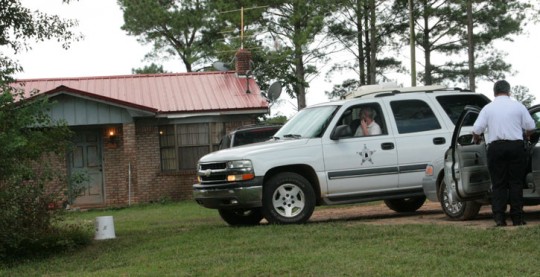 Pictured top: A Century Correctional Institution K-9 officer attempts to locate the trail of an attempted rape and home invasion suspect Thursday afternoon in Canoe, Ala. Pictured inset: A Century Correctional Institution and an Alabama Department of Corrections K-9 officer discuss the search. Pictured below: Authorities investigate a home invasion and attempted rape Thursday afternoon in Escambia County, Ala. NorthEscambia.com photos, click to enlarge.