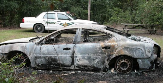 Shortly before 3:00, just before the end of his shift, Brown was on routine patrol at the Mystic Springs boat ramp on Mystic Springs Road east of Highway 29. That’s when he found the completely burned-out shell of a car near an Escambia River boat launch — about 12 miles from the reported theft location. The fire happened an unknown amount of time prior to the discovery; the vehicle was no longer warm.