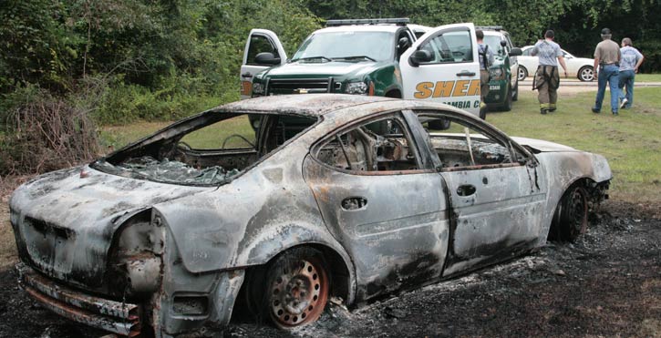 After finding what appeared to be traces of gold-colored paint around the burned-out car, deputies contact the woman who had reported her Pontiac missing earlier in the day. After arriving at the Mystic Springs boat ramp, the owner identified the burned vehicle as her own by body damage to the front quarter panel.