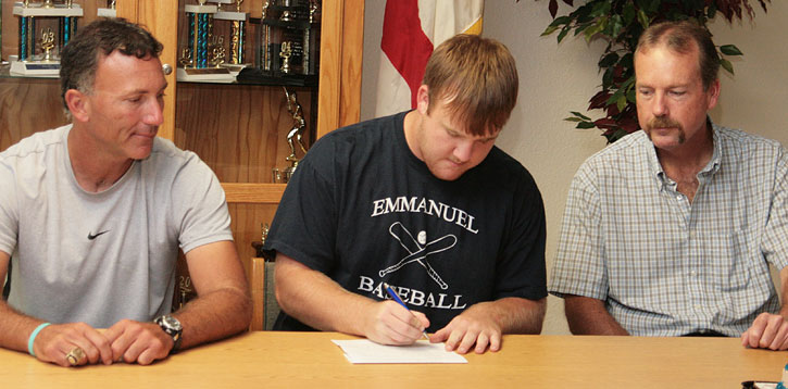 Pictured top: Heath Burkett (center) signs a baseball scholarship with Emmanuel College Thursday afternoon as his father, Rodney Burkett (right) and Northview Coach Sid Wheatley (left) looks on. Pictured inset: Burkett on the mound during his senior season with the Northview Chiefs. NorthEscambia.com photos, click to enlarge.