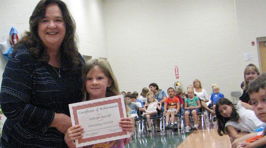 Pictured top: Molino Park Elementary School Principal Alice Woodward presents an award to Ashliegh Ratcliff last year. Pictured inset: Molino Park parent and volunteer Brandie Ratcliff with Camren McLemore. Submitted photos for NorthEscambia.com, click to enlarge.