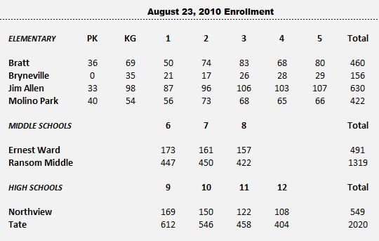 At Ernest Ward Middle School, there were 491 enrolled Monday. There were 1,319 at Ransom Middle School. Northview High School had an enrollment of 549 Monday, and there were 2,020 at Tate High.