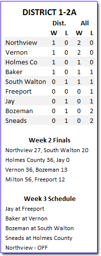 The Northview Chiefs are in serious contention for the state playoff berth with two district wins . Only four teams are perfect in district play — Northview (2-0, 1-0), Vernon (2-0, 1-0), Homes County (1-0, 1-0) and Baker (1-1, 1-0).