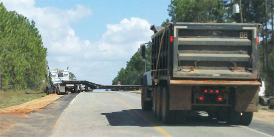 Traffic was blocked on a Barrineau Park Road for a short time Thursday afternoon by a stuck truck. The driver of the 18-wheel flatbed truck attempted to turn around and became stuck just west of Highway 29. Submitted photo by April Mitchell for NorthEscambia.com, click to enlarge.