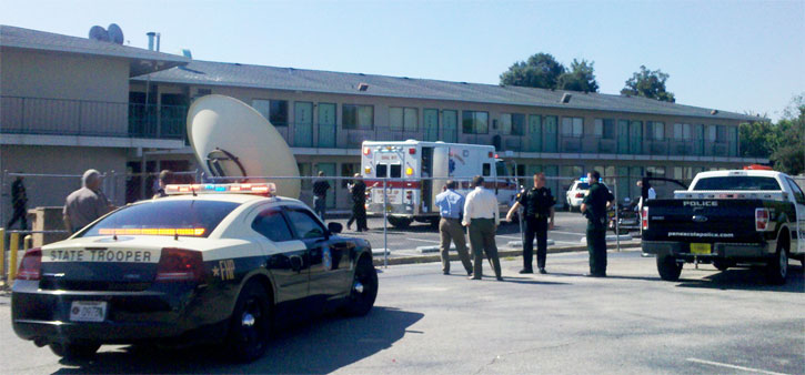 Pictured above: The scene after a deputy was shot and a suspect was shot and killed Wednesday morning at the Motel 6 on Pensacola Boulevard. Photo by Liz Nagy WEAR TV for NorthEscambia.com, click to enlarge.