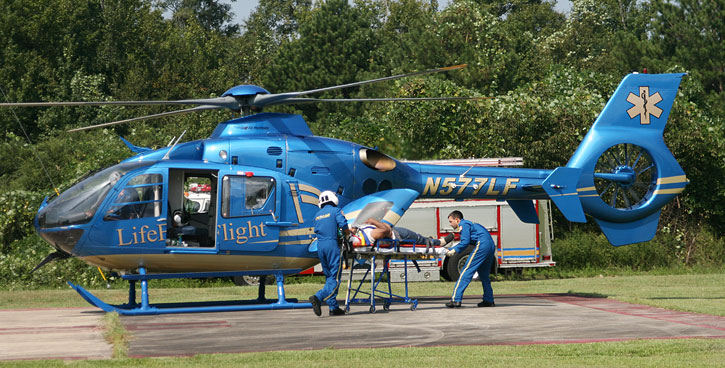 Pictured above: Two people were injured in this single vehicle crash Tuesday morning near Lake Stone on West Highway 4. Pictured below: An adult male was transported by LifeFlight to Sacred Heart Hospital. NorthEscambia.com photos, click to enlarge.