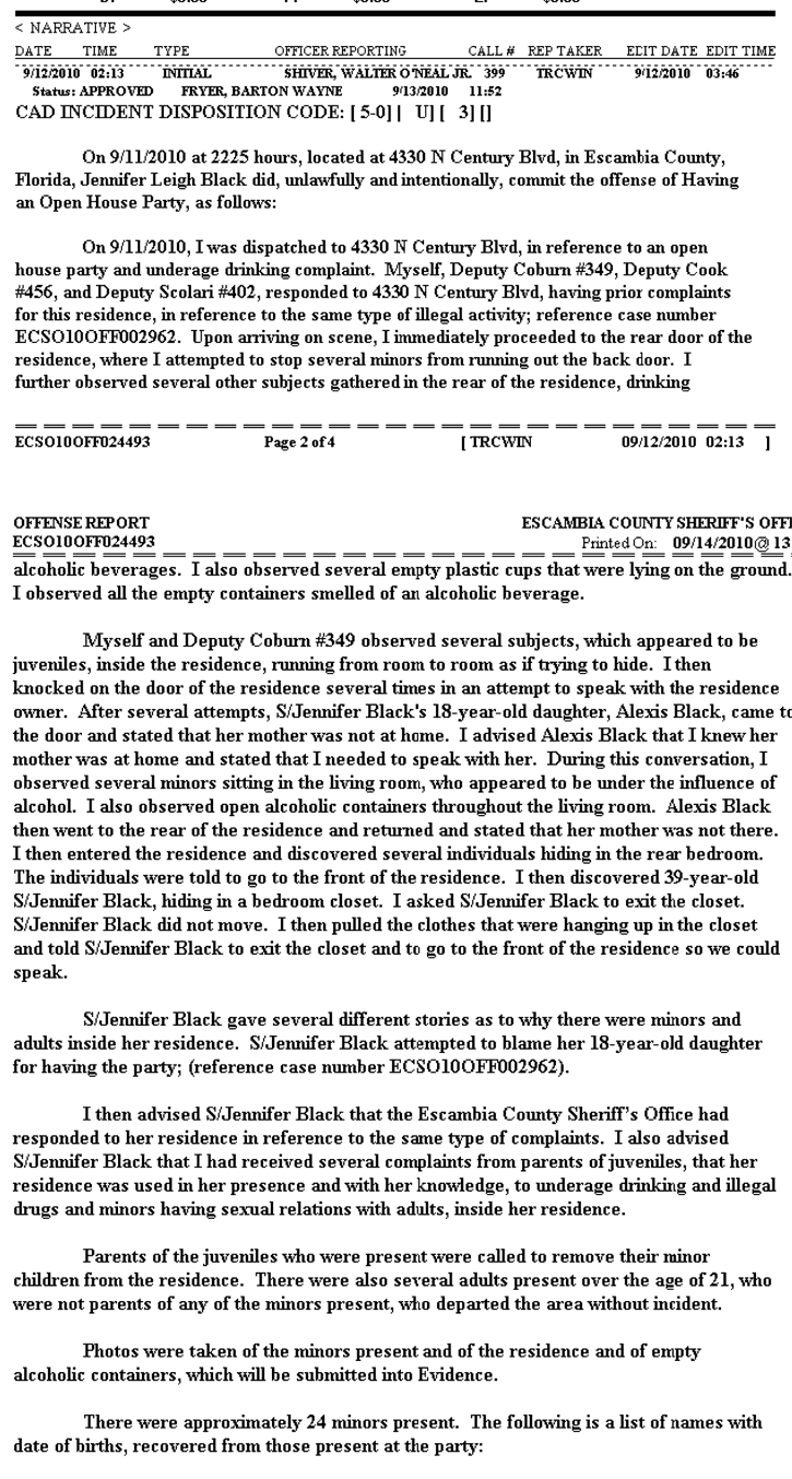 In his report, Deputy Walter Shiver said he told Jennifer Black that he had received  “several complaints from parents of juveniles that her residence was used in her presence and with her knowledge (for) underage drinking and illegal drugs and minors having sexual relations with adults”.