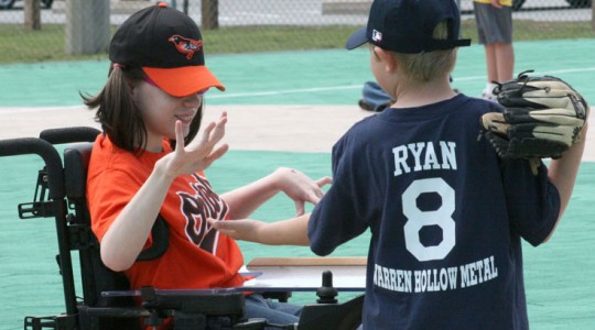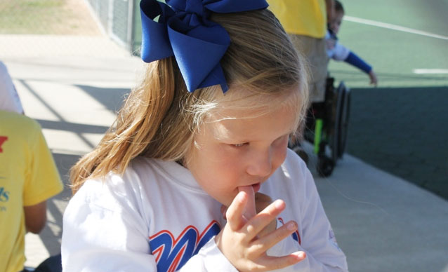 And now Olivia is a team player at the Miracle League, where every game ends in a tie. Every player hits; every player scores. There are no strikeouts, no errors. Everybody wins.