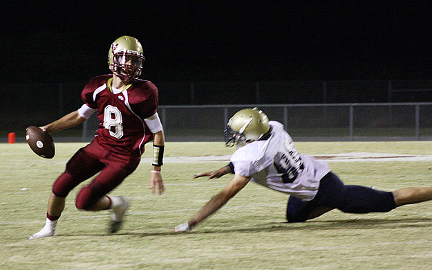 Pictured top: The Chiefs’ Brandon Sheets avoids a Bonifay defender tonight as Northview beat Holmes County.  Pictured top inset: A long Blue Devils pass is tipped off a by a Northview defender. Pictured below:  Roderick Woods escaped both pictured Blue Devil defenders for a huge gain. NorthEscambia.com photos, click to enlarge.