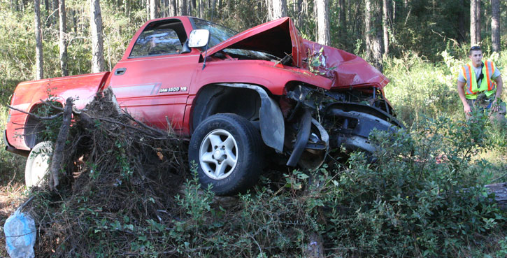 The accident happened about 7:20 a.m. on Highway 97 north of Hendricks Lane, between Molino and Walnut Hill. The Florida Highway Patrol said Tommy Styles, 67, of Pace, fell asleep, left the roadway in his Dodge Ram and struck a pine tree that was over a foot in diameter. The tree was knocked over by the force of the impact, and the truck came to rest on top of the base of the tree.