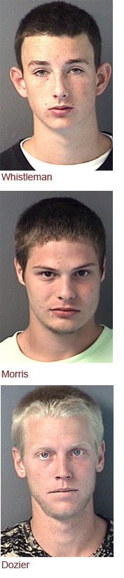 Bradley William Morris, 19, of Cedar Tree Lane; William Edward Cody Whistleman, 19, of Highway 297A; and Johnny Charles Dozier, 25, of Highway 297A were each charged with felony grand theft, felony burglary of a vehicle and criminal mischief in connection with the incident.