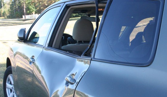 Last Friday morning, one member of a family vacationing from Tennesee was injured on Highway 29 near Bogia Road in McDavid when a deer jumped into the side of their vehicle. Glass shards from a broken side window (pictured) sent one person to the hospital with lacerations.