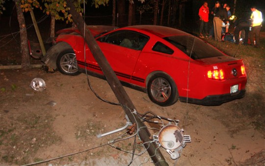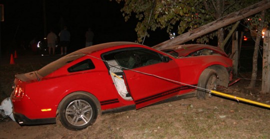 The accident happened about 8:40 p.m. in the 7900 block of Highway 97A. The driver of a Ford Mustang failed to negotiate the sharp curve, left the roadway and crashed into a power pole. The impact brought down the pole and sent power lines across Highway 97.