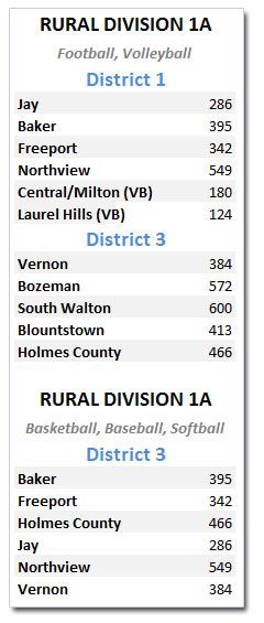 District 1-1A Rural includes Jay, Baker, Freeport and Northview, plus Central and Laurel Hills for volleyball only. For boys and girls basketball, baseball and softball, Northview and Jay joins Baker, Freeport, Holmes County and Vernon in District 3-1A.