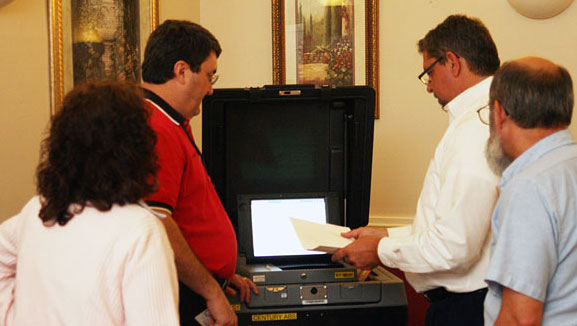 Pictured top: Ballots are counted for a Century town council election by Escambia County elections officials. Pictured inset: Escambia County Supervisor of Elections David Stafford and members of the Century Canvassing Board tabulate votes. NorthEscambia.com file photos, click to enlarge.