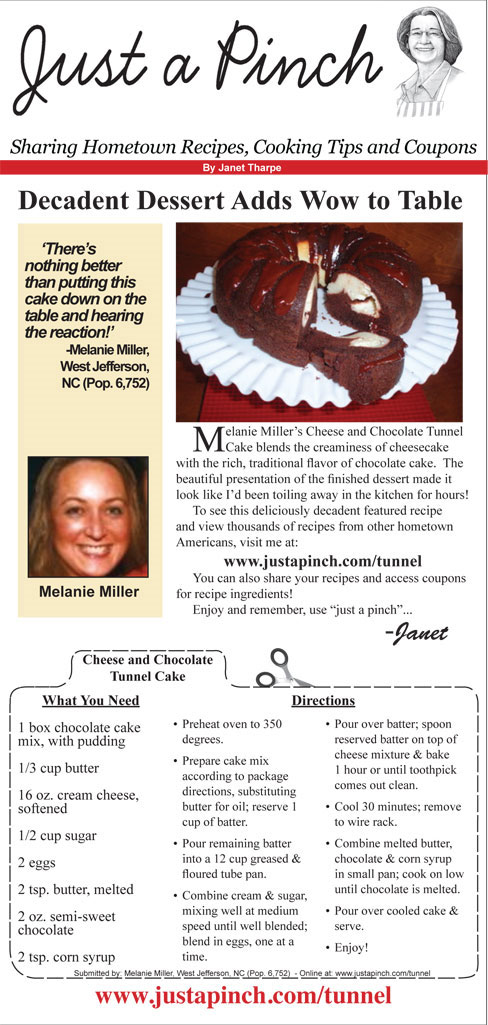 This weekend’s featured recipe from Janet Tharpe is a Cream Cheese and Chocolate Tunnel Cake with the creaminess of cheesecake and the rich, traditional flavor of chocolate cake.