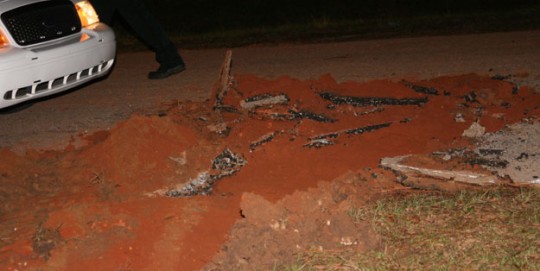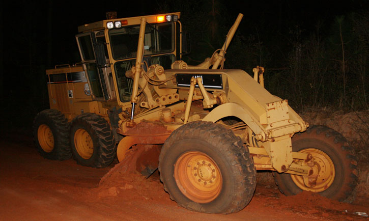 Pictured top and below: A stolen Escambia County road grader became stuck on Pineville Road Saturday night. Picture inset: A section of Arthur Brown Road was destroyed by the blade on the road grader. NorthEscambia.com photos, click to enlarge.