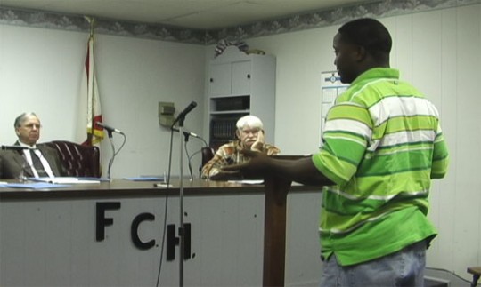 Pictured top: Flomaton Police Chief Katarius Jenkins addresses the Flomaton Town Council Tuesday night. Pictured top inset: Flomaton Mayor Dewey Bondurant. Pictured middle inset: Jenkins listens as the council discusses his future with the town. NorthEscambia.com photos, click to enlarge.